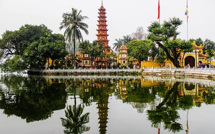 Our first stop is the ancient Tran Quoc Pagoda, a peaceful oasis on a small island. We’ll then cycle to Phu Tay Ho, a sacred temple with a rich history. Next, we’ll visit the West Lake Flower Valley, where you can take beautiful pictures. The highlight of our tour is a stop at Dao Ngoc, where you can explore and take photos with a beautiful retro tram car.